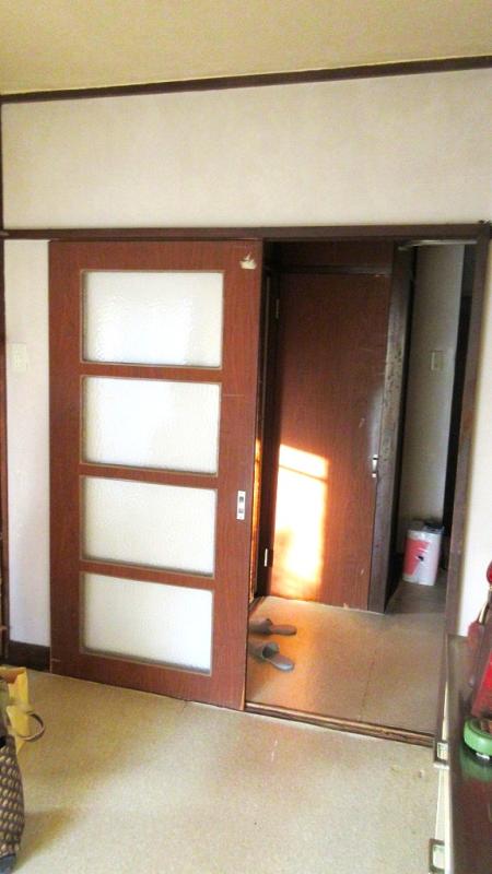 廊下からの入口ドアはお取替え。造作で作った2列の大きなガラスの入った引戸は、明るくおしゃれです。