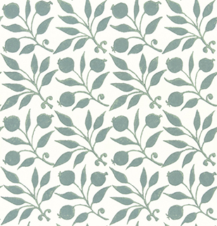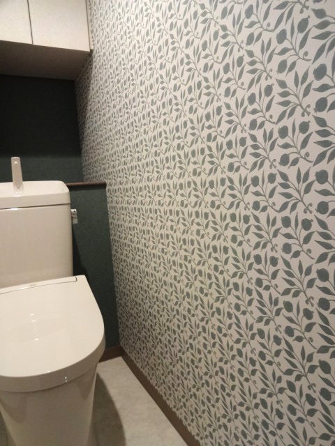壁には、ウィリアムモリスのクロス「ローズヒップ」をアクセントとして使用。もともとはタイルの柄として使用されていた図案で、タイルのようなインクのような、味わい深い色合いです。