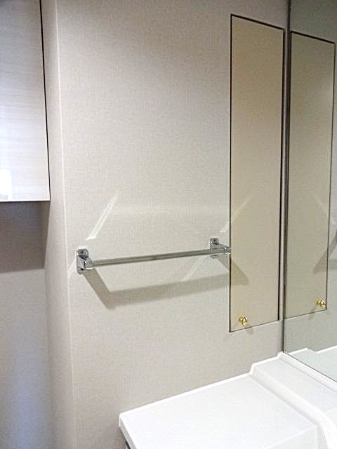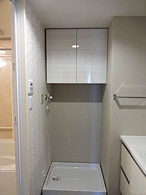 クロスは、洗面化粧台の背面のみ柄のクロスを貼り、アクセントとしています。