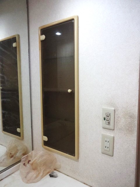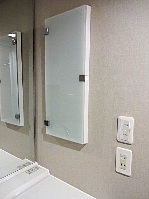 向かって右側にある埋込収納は、中が見えないタイプへと取り換え。白い扉がかわいらしいです。