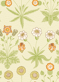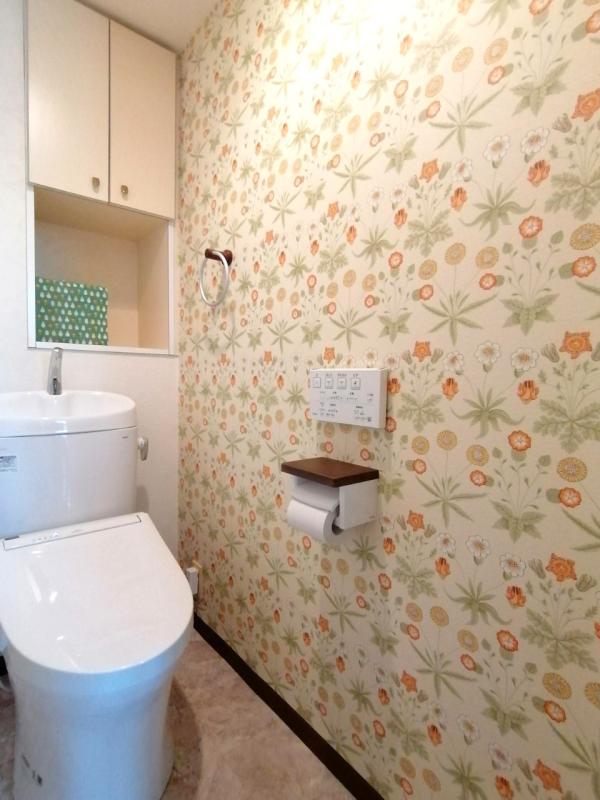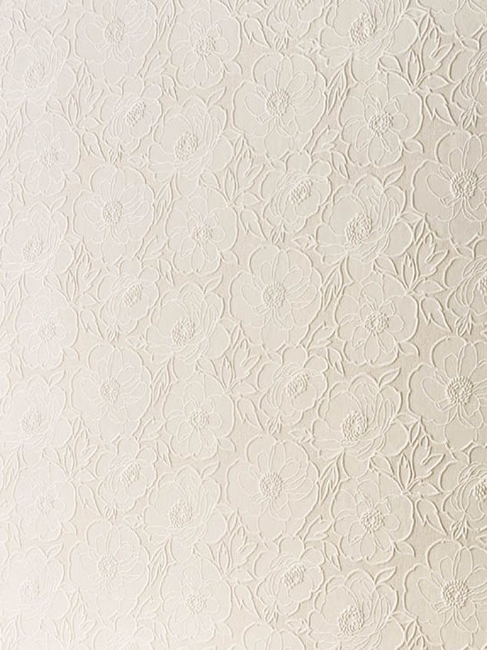 壁のクロスには、ウィリアムモリスの「デイジー」を使用。草原の花がモチーフの明るくかわいい柄で、目を引きます。その周りには、パール感のある白い花柄のクロスを選択。色は白のみですが、存在感があります。