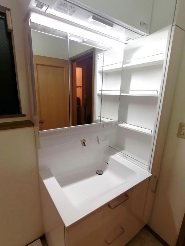 洗面化粧台と同時工事で、緊急止水弁付の水栓への交換と洗濯機パンの取付を行いました。
