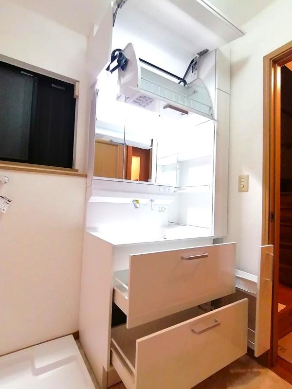 開き戸タイプから2段の引き出しタイプへ変更し、奥まで無駄なく収納できるようにしました。足元には体重計が付いています。