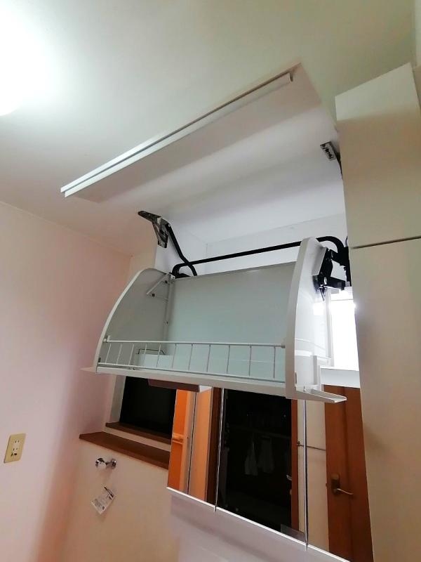 上部のウォールキャビネットは、クイック昇降式のもので、高い位置でも取り出しやすくなっています。