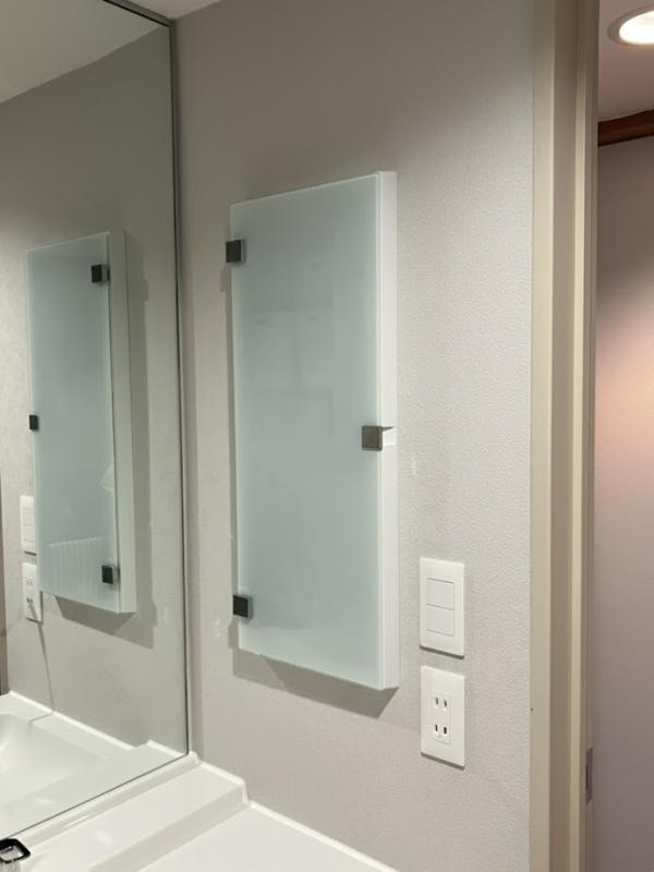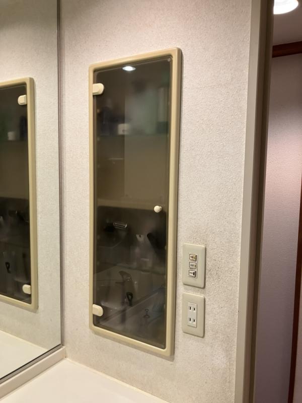 壁の埋込収納は、中が見えないタイプの扉が付いたものに変更しました。