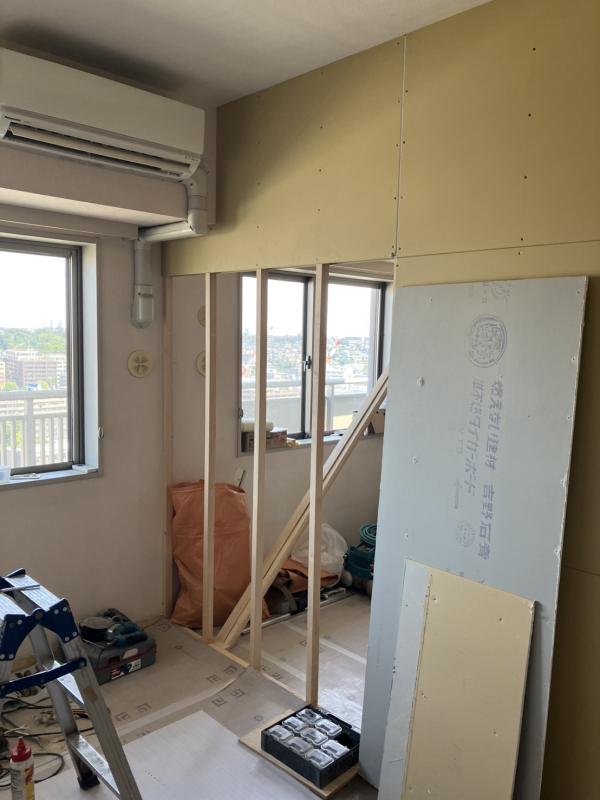 大きな1つの部屋の真ん中に間仕切り壁を作り、2つの部屋に分けました。
